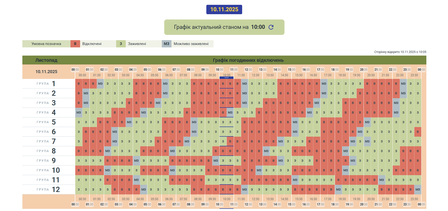 АТ «Чернівціобленерго» оприлюднило графік погодинних відключень електроенергії на сьогодні, 10 листопада.