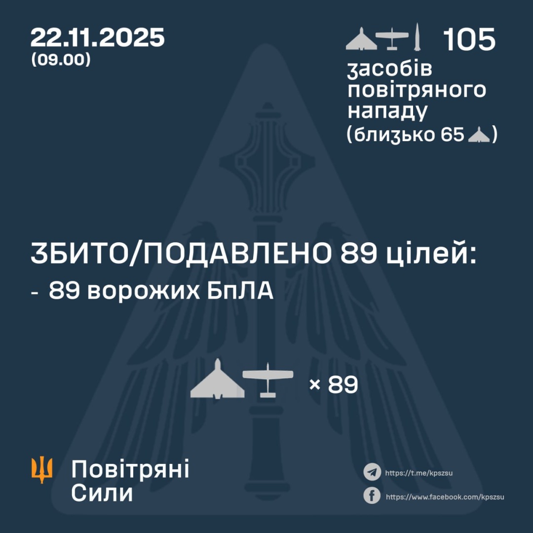 За попередніми даними, станом на 09:00 суботи, 22 листопада, ППО збила / подавила 89 дронів на півночі, півдні та сході України.