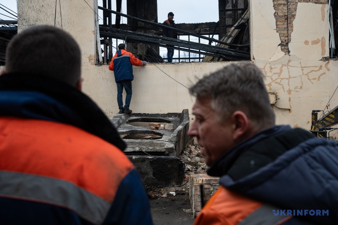 На території депо перше, що відчувається, – запах гару. Він досі зберігається в повітрі після нічного удару 6 грудня. Перед очима постають значні руйнування, зокрема, три знищені вагони, вкриті сажею. Далі переходимо через заготівельний цех і бачимо, що розбір завалів триває. Працюють крани, фахівці координують роботу техніки, намагаючись перекричати її гуркіт та гул.