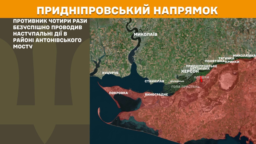 На Придніпровському напрямку загарбники чотири рази безуспішно проводили наступальні дії в районі Антонівського мосту.