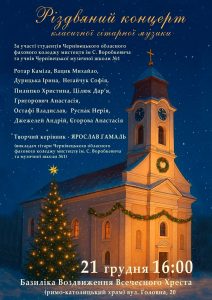 У Чернівцях 21 грудня о 16:00 у Базиліці Воздвиження Всечесного Хреста (вулиця Головна, 20) вперше відбудеться різдвяний концерт класичної гітарної музики. Його учасники — студенти Чернівецького обласного фахового коледжу мистецтв ім. С. Воробкевича та учні Чернівецької музичної школи №1.