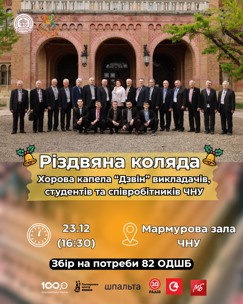 23 грудня о 16:30 у Мармуровій залі Чернівецького національного університету імені Юрія Федьковича відбудеться благодійний різдвяний концерт «Різдвяна коляда». До святкового дійства запрошують чернівчан та гостей міста.