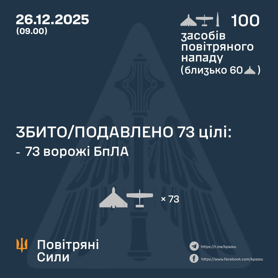 Протиповітряна оборона знешкодила 73 із 99 безпілотників, яким росіяни атакували Україну з вечора 25 грудня. Зафіксоване влучання балістичної ракети та 26 ударних БпЛА.