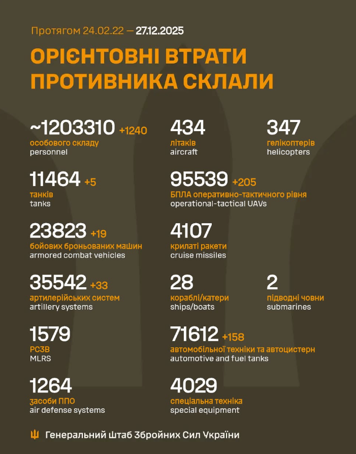 Ми зібрали для вас інформацію про тисяча чотириста третій день Великої війни: чим жили Україна та українці 27 грудня 2025 року.