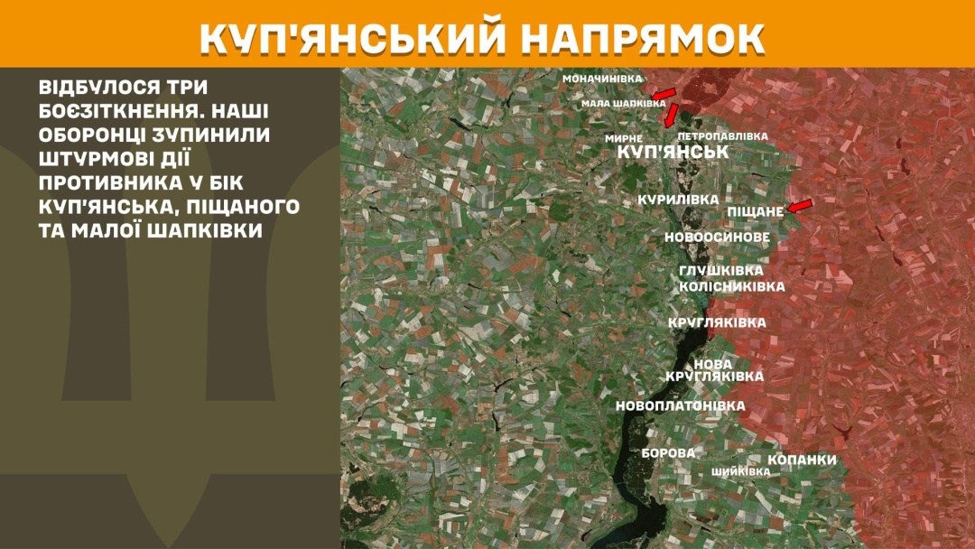 На Куп’янському напрямку сталося три боєзіткнення. Сили оборони зупинили штурмові дії росіян у бік Куп’янська, Піщаного та Малої Шапківки.