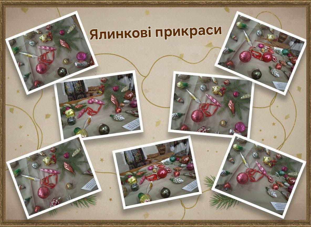 У виставковій залі представили колекцію скляних новорічних іграшок, які відображають особливості побуту та декоративно-прикладного мистецтва минулого століття. Експозиція демонструє зміну художніх стилів і технологій виробництва ялинкових прикрас.