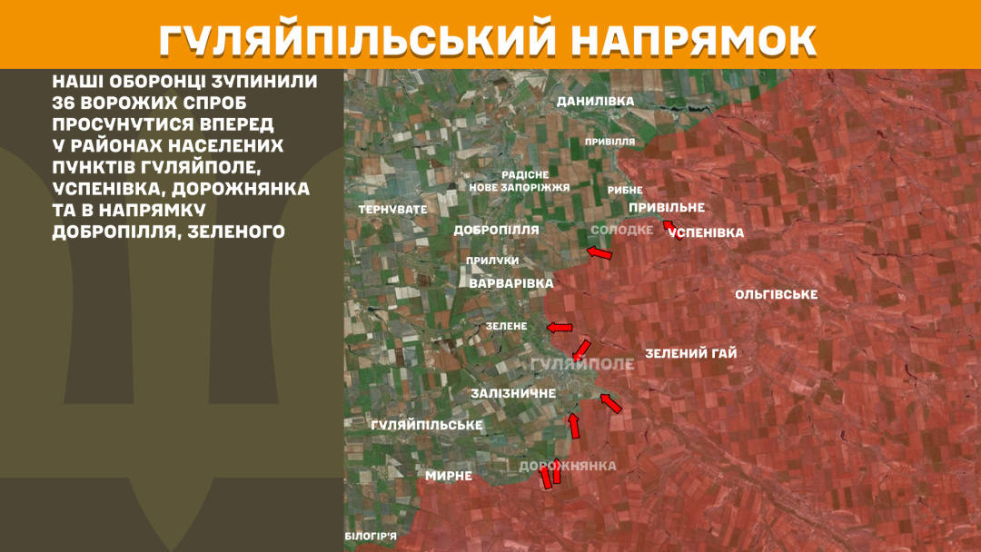 На Гуляйпільському напрямку українські оборонці зупинили 36 ворожих спроб просунутися вперед у районах населених пунктів Гуляйполе, Успенівка, Дорожнянка та в напрямку Добропілля, Зеленого.