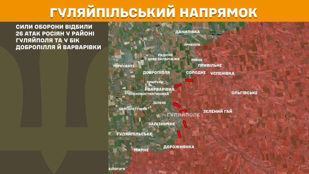 На Гуляйпільському напрямку Сили оборони відбили 26 атак росіян у районі Гуляйполя та у бік Добропілля і Варварівки.
