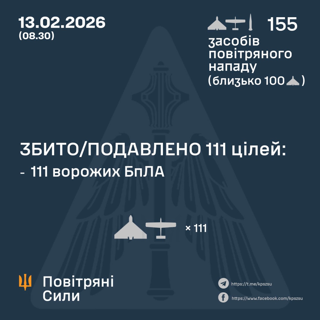 За попередніми даними, станом на 08:30 п'ятниці, 13 лютого, ППО збила/подавила 111 російських БПЛА типу Shahed, "Гербера", "Італмас" та дронів інших типів.