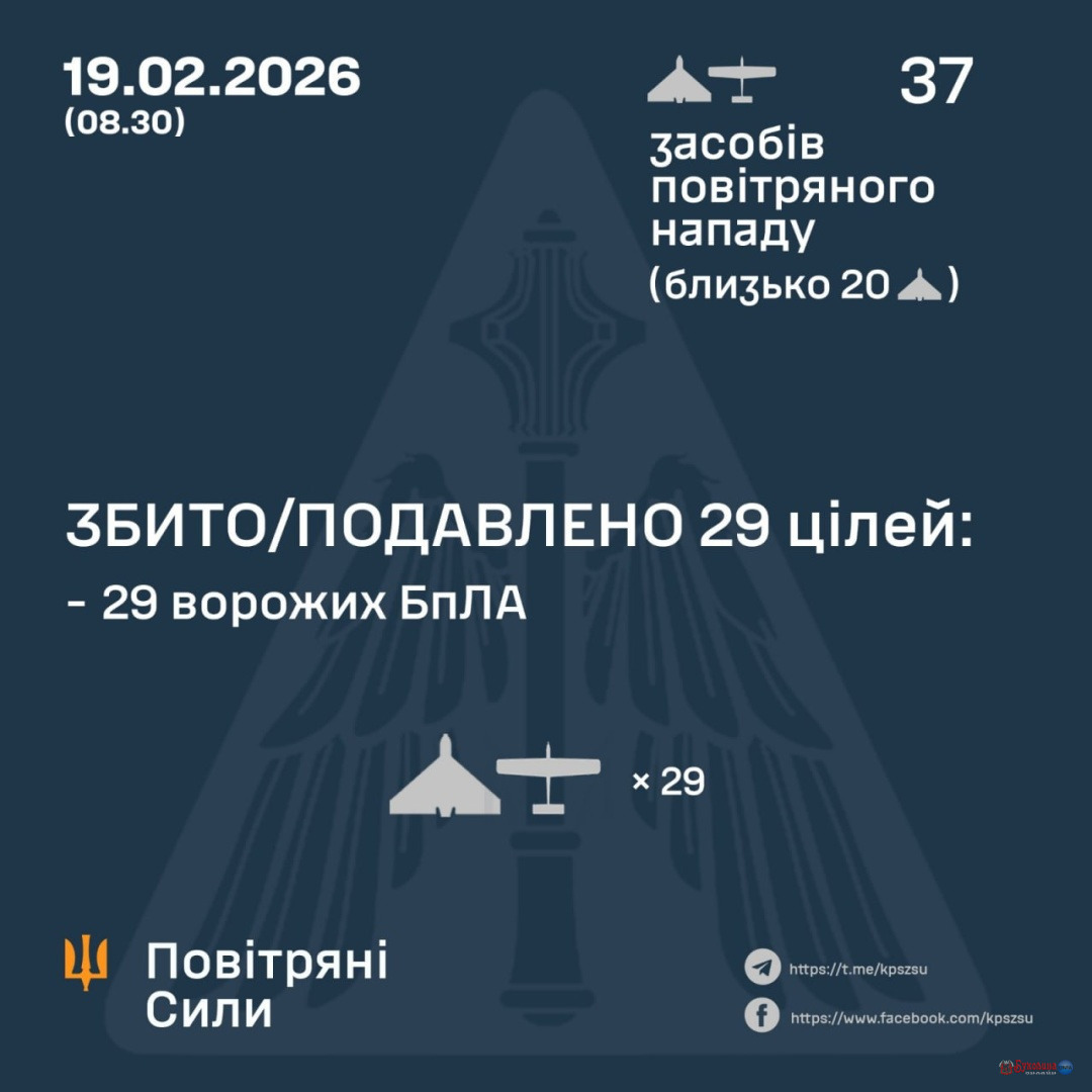 За попередніми даними, станом на 08:30 четверга, 19 лютого, ППО збила/подавила 29 безпілотників на півночі, півдні та сході країни.