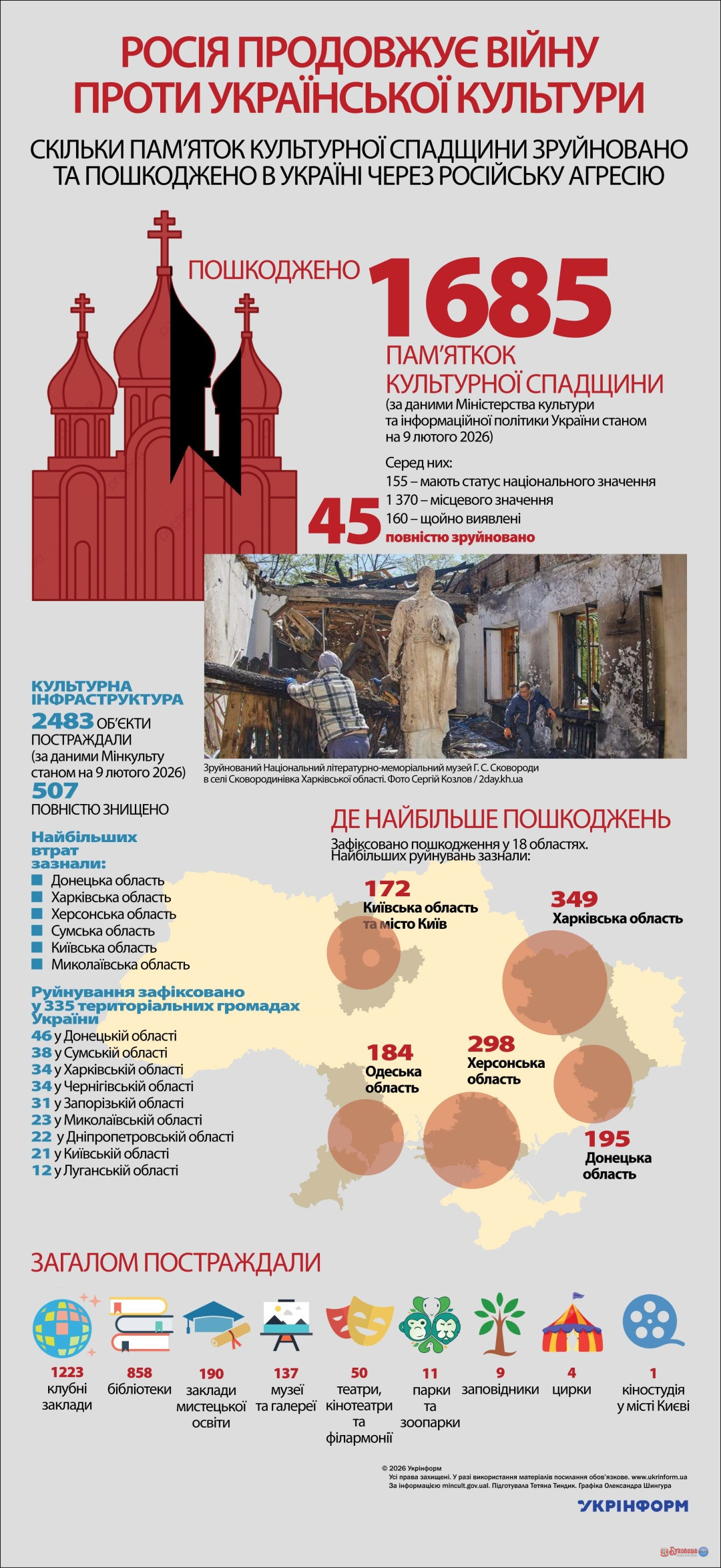 Росія продовжує війну проти української культури 20.02.2026 11:08 Укрінформ Скільки пам’яток культурної спадщини зруйновано та пошкоджено в Україні через російську агресію За інформацією ЗМІ. Використано ілюстрації з сайтів pngwing.com, pngegg.com, flaticon.com, pngtree.com Перше фото: знищений музей генерал-хорунжого УПА Романа Шухевича у Львові. Фото Максима…