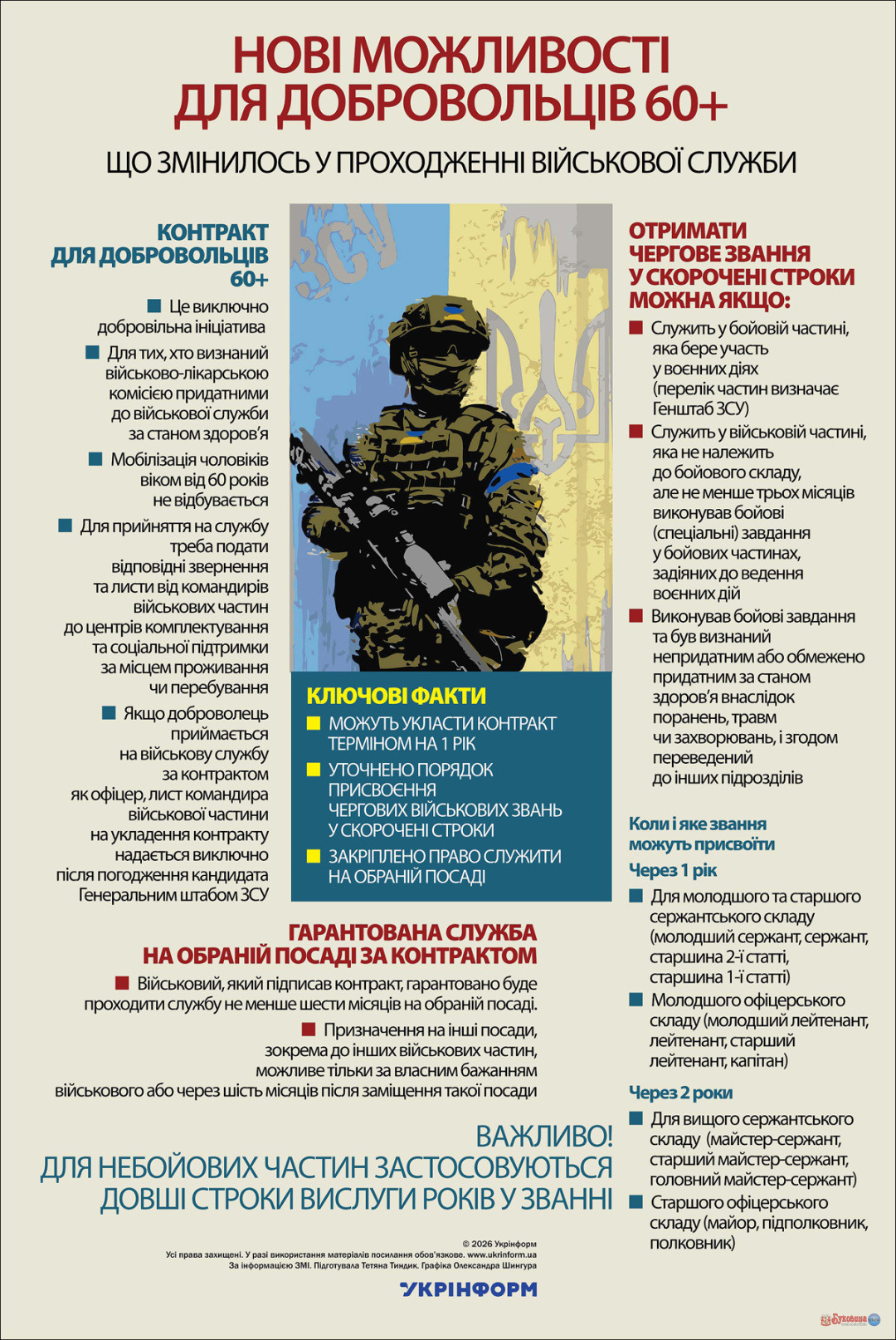 Нові можливості для добровольців 60+ 25.02.2026 12:20 Укрінформ Що змінилось у проходженні військової служби За інформацією ЗМІ Новини з передової