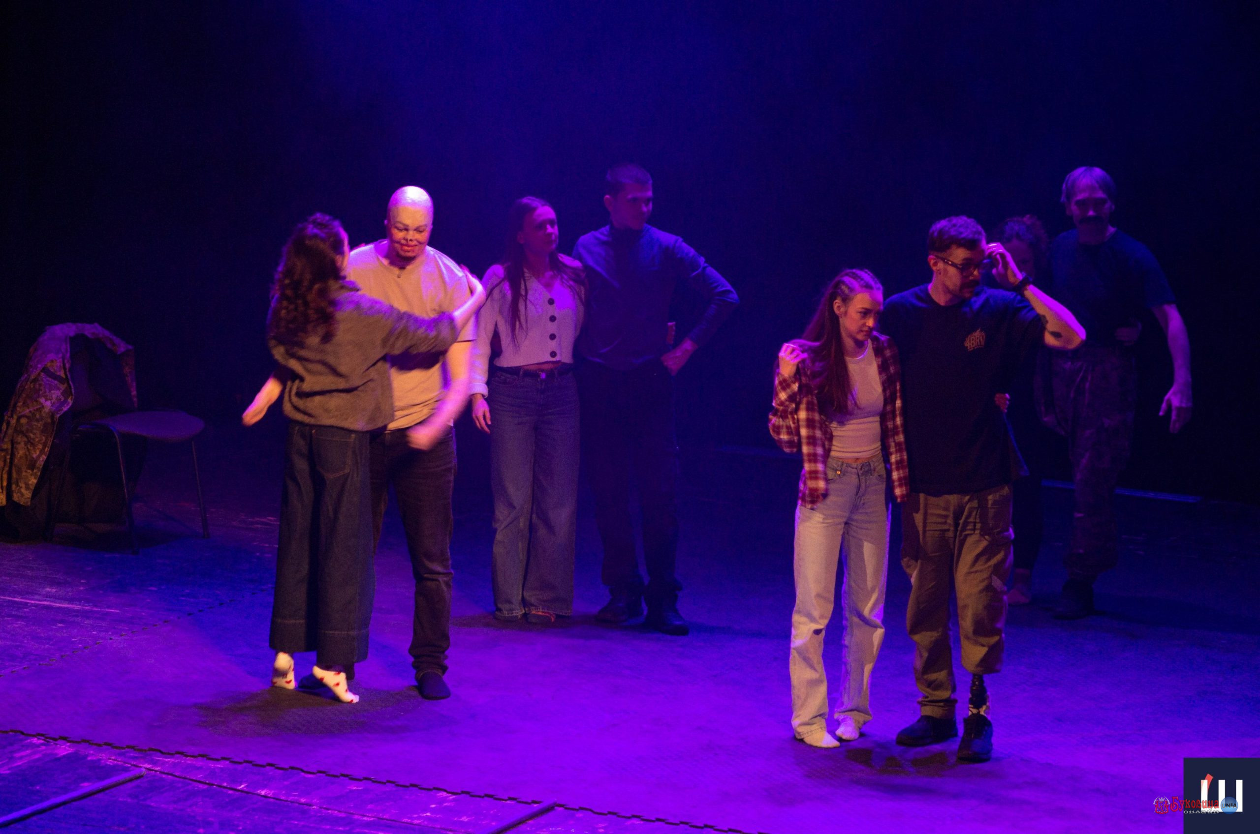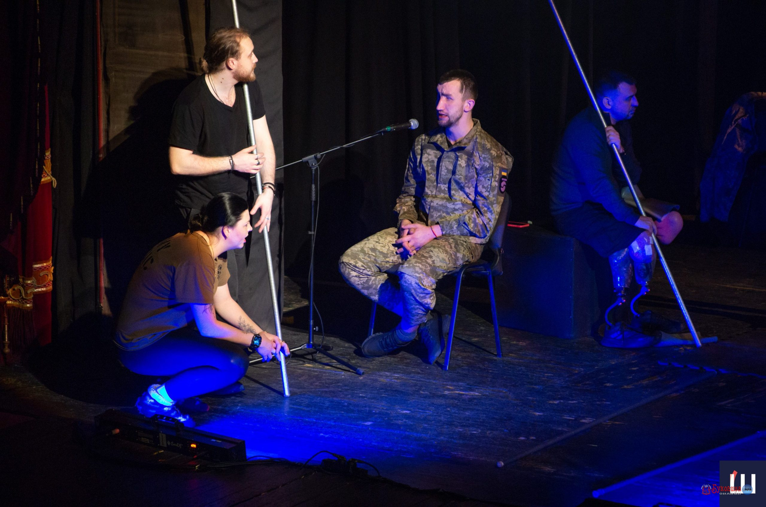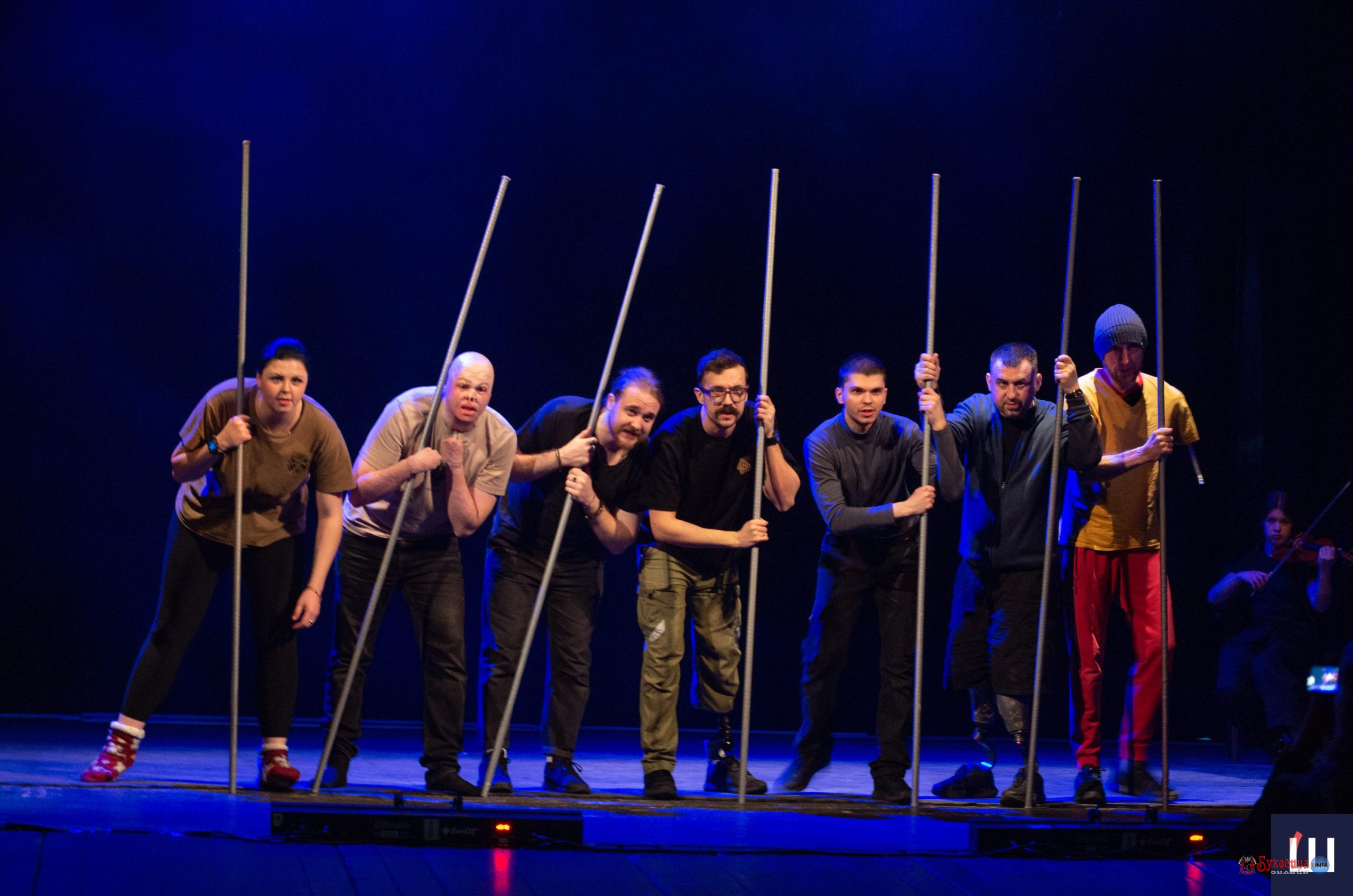 На сцені — чинні військовослужбовці та ветерани російсько-української війни. Дехто з них — на протезах, із важкими пораненнями, але з тією внутрішньою силою, яку складно передати словами. Вони не грають війну — вони її прожили.
