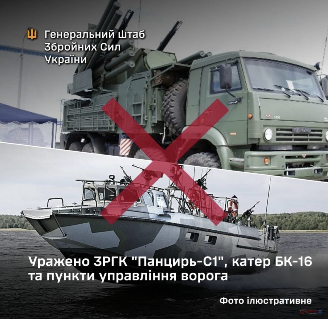 - зенітний ракетно-гарматний комплекс "Панцирь-С1" та десантний катер БК-16 у районі тимчасово окупованого Новоозерного (Крим);