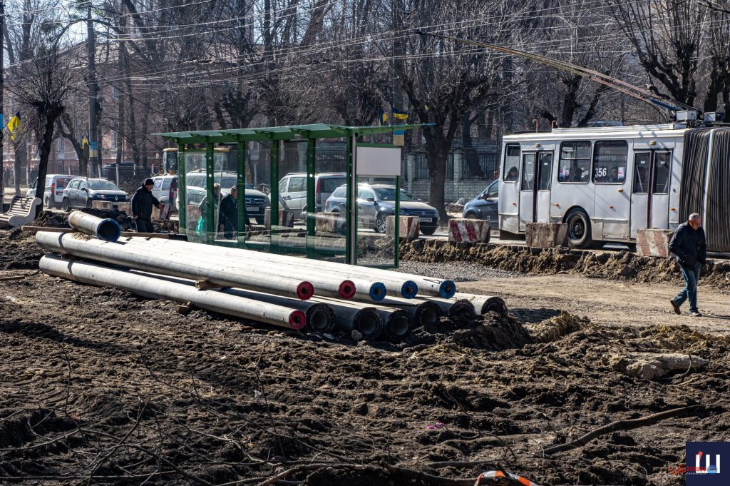 Паралельно тривають роботи з облаштування дороги. Уже підготували основу та заасфальтували 153 метри проїзної частини. На ділянці проклали 18 метрів газової труби, встановили три опори для світлофорів та 11 опор контактної мережі — це стовпи, на яких тримаються дроти для електротранспорту.