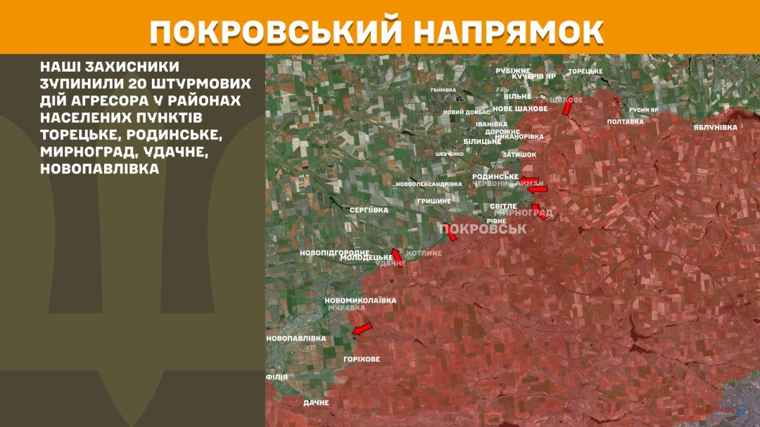 На Покровському напрямку українські оборонці зупинили 20 штурмових дій ворога в районах Торецького, Родинського, Мирнограда, Удачного й Новопавлівки.