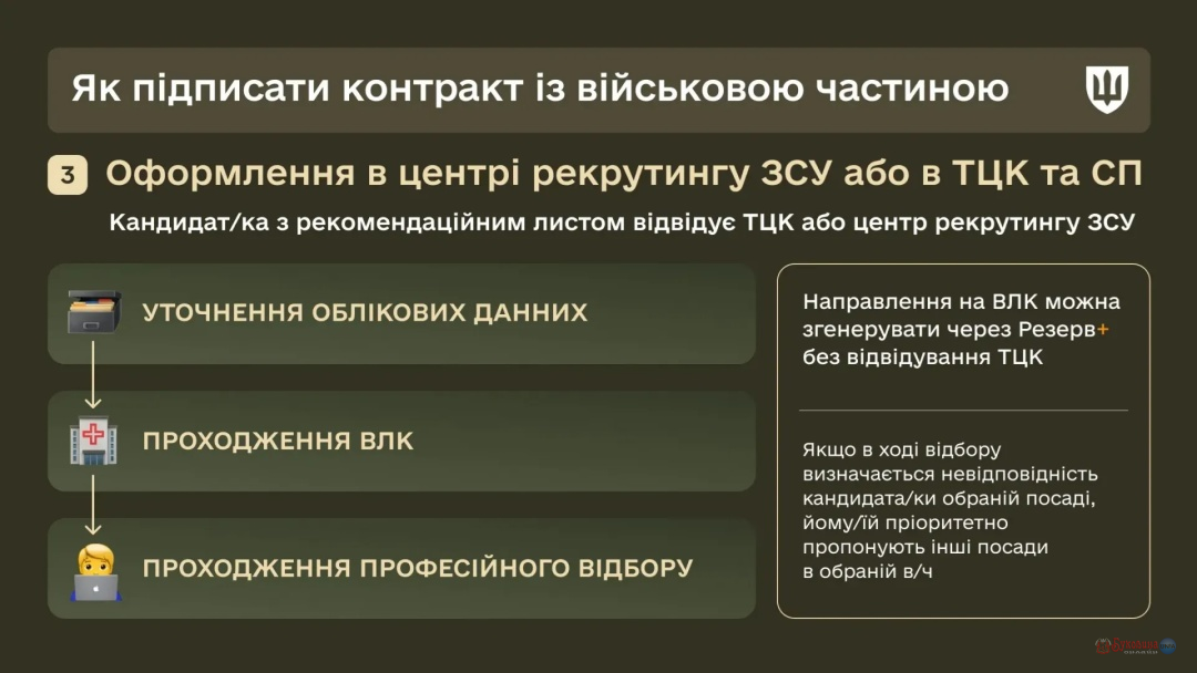 "Після обрання посади починається комунікація (самостійно чи з допомогою рекрутера) з відповідною військовою частиною. Як правило, вона включає етапи співбесіди, перевірки фізичної готовності і психолого-діагностичного тестування", – зазначили у міністерстві.