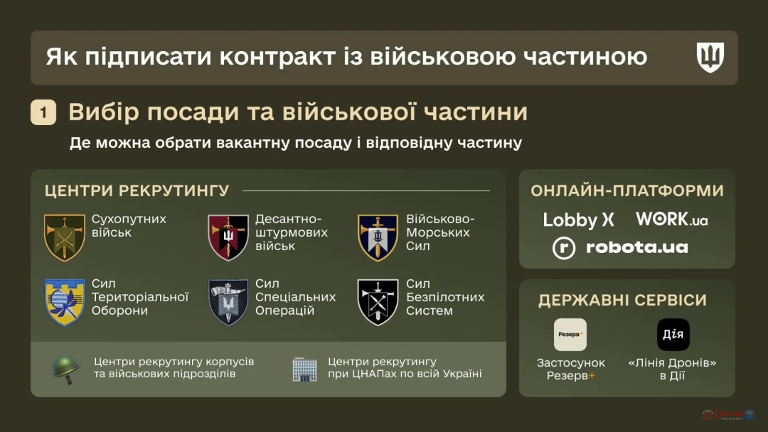 Шлях до контрактної служби варто починати з пошуку вакансії та конкретної військової частини. Це можна зробити через: