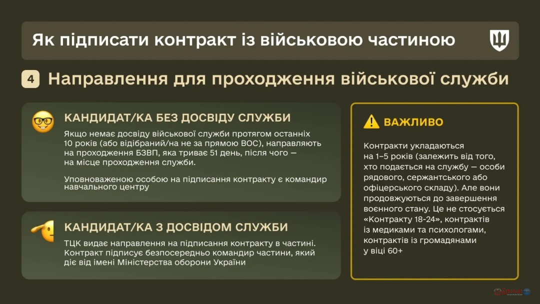 "Варто мати на увазі, якщо кандидат не має досвіду військової служби протягом останніх 10 років (або відібраний не за прямою ВОС), його направляють на проходження базової загальної військової підготовки, яка триває 51 день, після чого – на місце проходження служби. Таким чином, уповноваженою особою на підписання контракту є командир навчального центру", – пояснили у Міноборони..