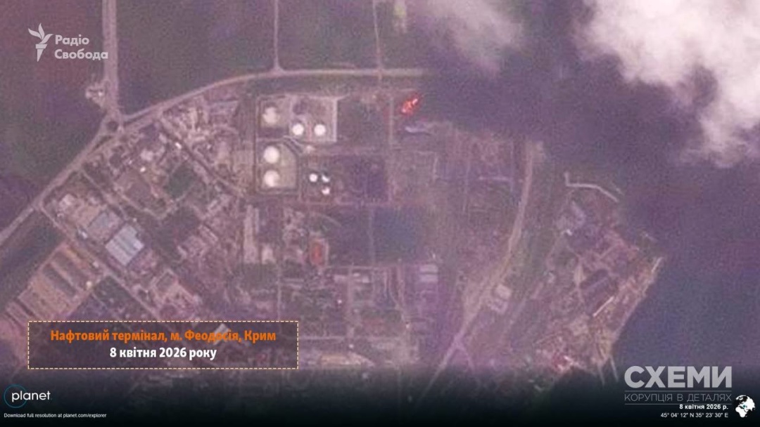 На знімках компанії Planet Labs за 8 квітня, які є у розпорядженні журналістів "Схем" (Радіо Свобода), видно пожежу та клуби диму на території ключової нафтобази окупованого Росією Криму – "Морський нафтовий термінал" у Феодосії.