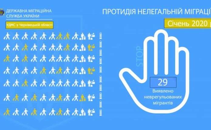 Працівниками підрозділу з протидії нелегальній міграції, реадмісії та видворення та тер-підрозділів УДМС у Чернівецькій області впродовж січня 2020 року виявлено 29 неврегульованих мігрантів, прийнято рішення про примусове повернення щодо 29-ти іноземців та про примусове видворення – щодо 1-го, 2-м особам заборонено в’їзд на територію України, 1-го неврегульованого мігранта тимчасово поміщено до ПТПІ. Про це йдеться на сайті Управління ДМС у Чернівецькій області.