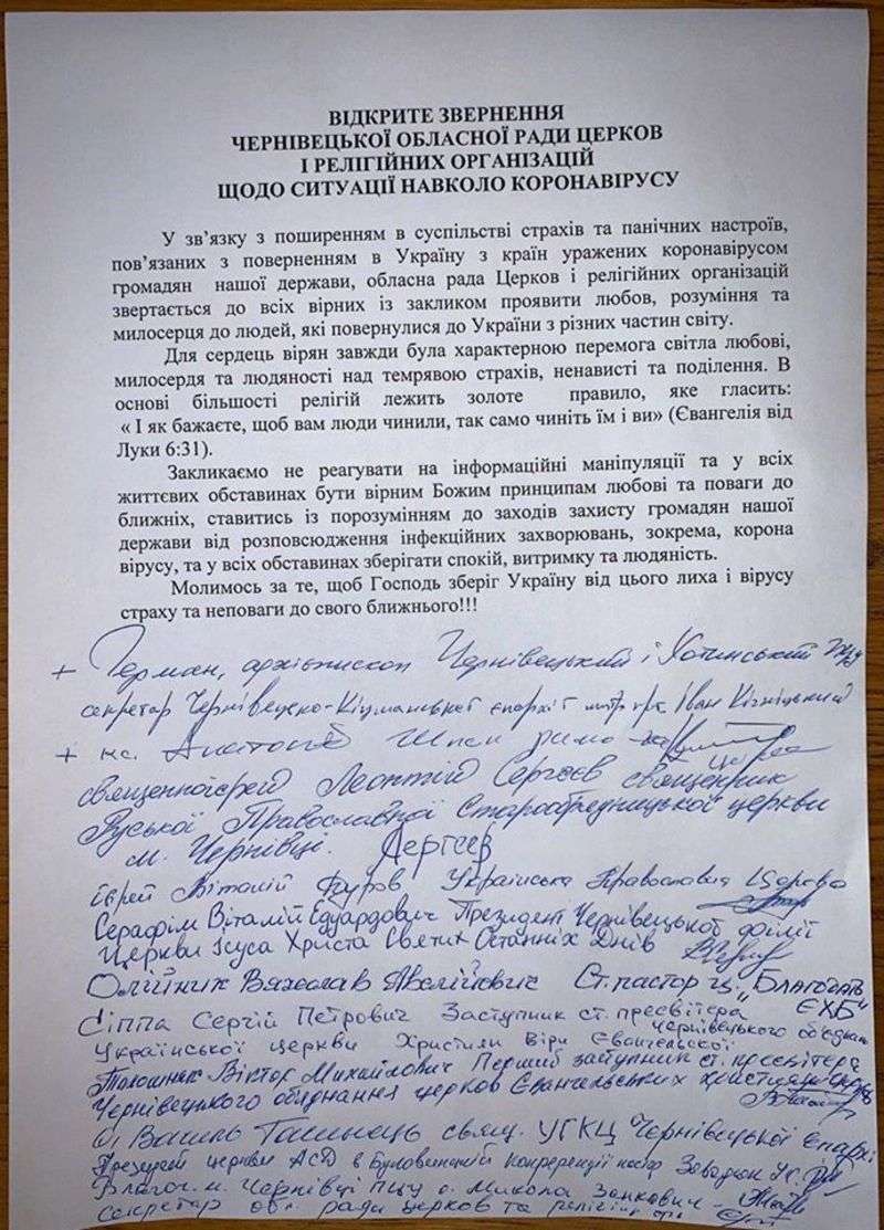 “Закликаємо не реагувати на інформаційні маніпуляції та у всіх життєвих обставинах бути вірними Божим принципам любові та поваги до ближніх, ставитись із порозумінням до заходів захисту громадян нашої держави від розповсюдження інфекційних захворювань, зокрема, коронавірусу, та в усіх обставинах зберігати спокій, витримку і людяність”, – ідеться у тексті документа. Про це повідомляють на офіційній фейсбук-сторінці Чернівецької ОДА.
