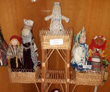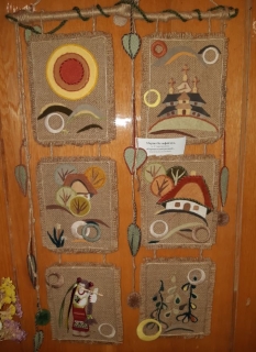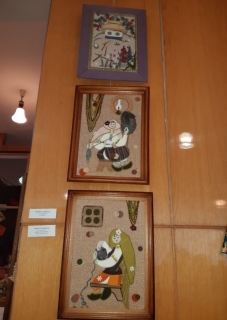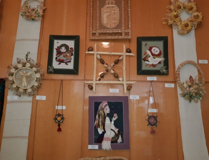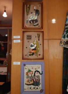 Марія Остафійчук показує свої стилізовані ляльки-мотанки, красиві картини та гобелени з використанням текстильної аплікації. Цілі композиції: “Весільний танок”, “Жили-буди дід та баба”, “Соняшники”… На виставці представлено майже 50 її робіт.