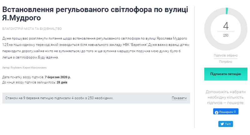“Дуже прошу вас розглянути питання щодо встановлення регульованого світлофора по вулиці Ярослава Мудрого 125, на пішоходному переході, який зназодиться біля навчального закладу НВК “Берегиня”. Дуже важко вранці дітям переходити дорогу, майже ніхто не зупиняється,і до того ж ще зупинка маршруток поруч, на мою думку було б легше з світлофором”, – йдеться у петиції.