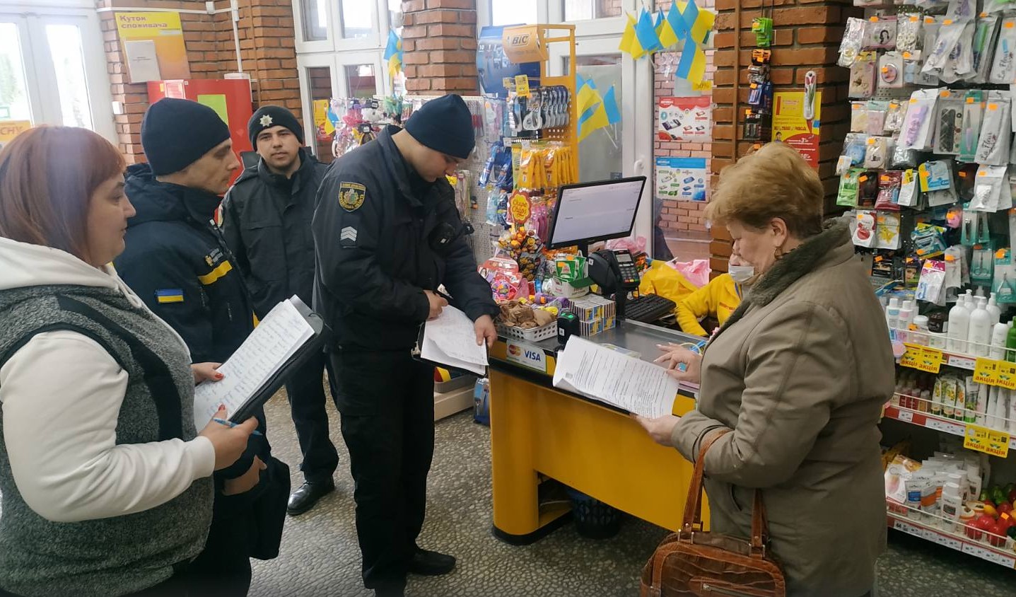 Поліцейські спільно з представниками ДСНС та держпродспоживслужби області? створили мобільні групи, які перевіряють торгові заклади, міні-, супер- і гіпермаркети, торгово-розважальні центри, кінотеатри, театри, спортивні комплекси, лазні та ринки та проводять з їхніми адміністраціями інформаційно-роз’яснювальну роботу.