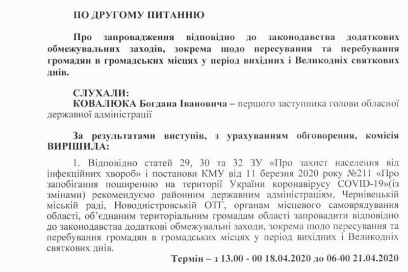 Згідно з інформацією, оприлюдненою у відповідному протоколі комісії, рішення передбачає “рекомендувати районним державним адміністраціям, Чернівецькій міській раді, Новодністровській ОТГ, органам місцевого самоврядування та об’єднаним територіальним громадам запровадити відповідно до законодавства додаткові обмежувальні заходи, зокрема щодо пересування та перебування громадян в громадських місцях у період вихідних і Великодніх святкових днів”. Тимчасові обмеження діятимуть з 13:00 18 квітня до 6:00 21 квітня.