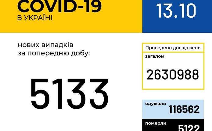 13 жовтня 2020 року (станом на 9:00) в Україні 270 587 лабораторно підтверджених випадків COVID-19, із них 5 122 летальних, 116 562 пацієнти одужали. За добу зафіксовано 5 133 нових випадки. Загалом проведено 2 630 988 тестувань методом ПЛР. За добу одужало 2 152 пацієнти. Про це повідомляє телеграм-канал Коронавірус Інфо.