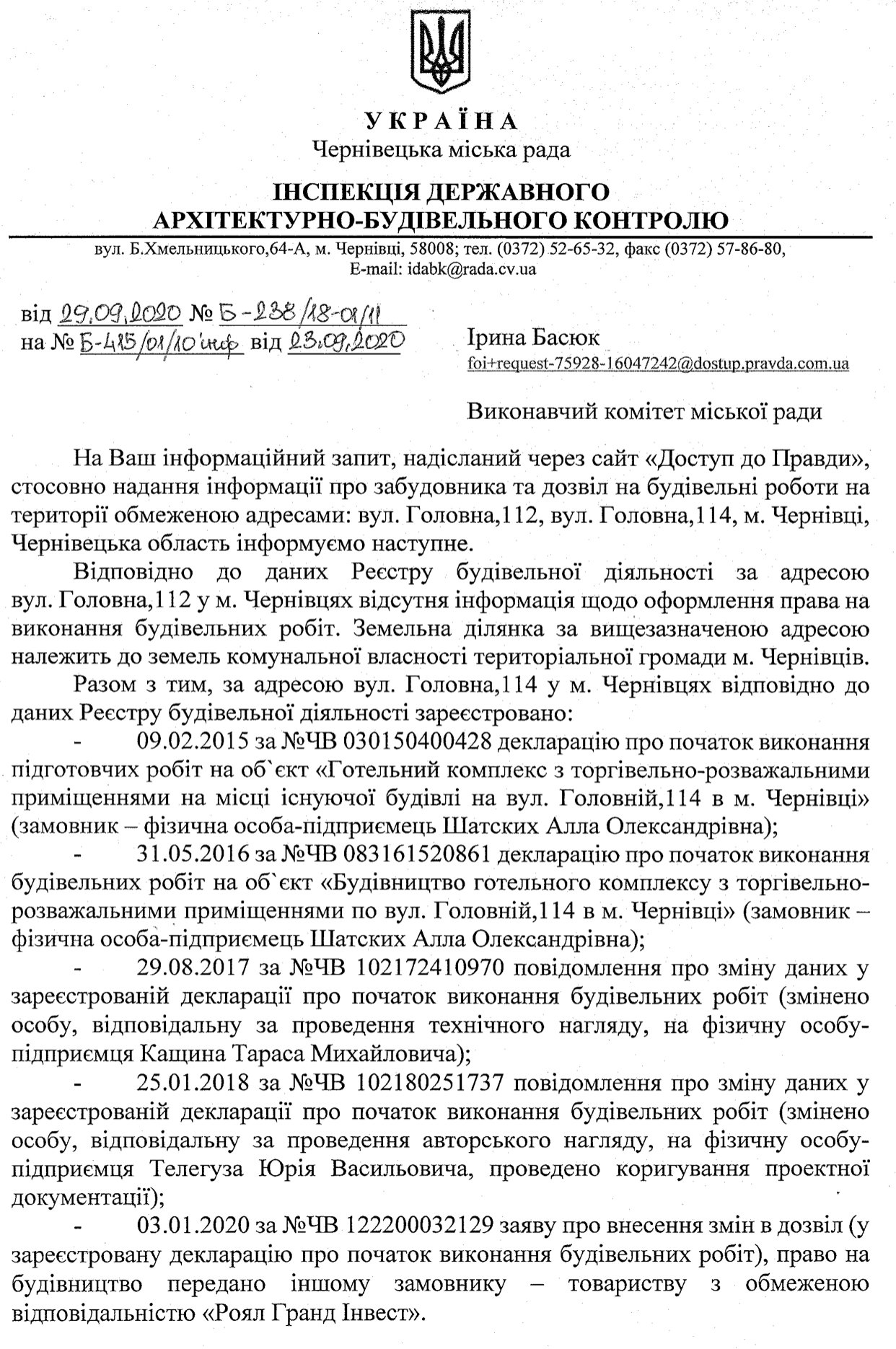 До речі, Чернівецька міськрада у відповіді на запит також пише, що фізична особа-підприємниця Шатських А.О. надсилала повідомлення до управління державної архітектурно-будівельної інспекції у Чернівецькій області про зміну генерального підрядника. А до Інспекції державного архітектурно-будівельного контролю ще 3 листи: 2 повідомлення про зміну генерального підрядника (у лютому і серпні 2017 року) і про зміну генерального проєктувальника у січні 2018.