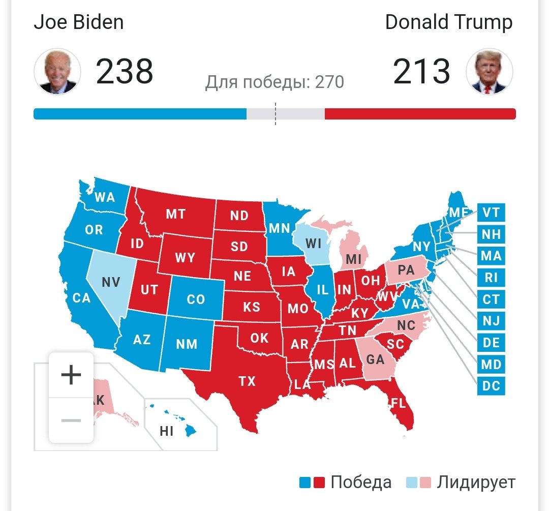 Переможе той, хто набере 270 голосів виборців. Зараз у Трампа 213, а Байден має невелику перевагу — 238.