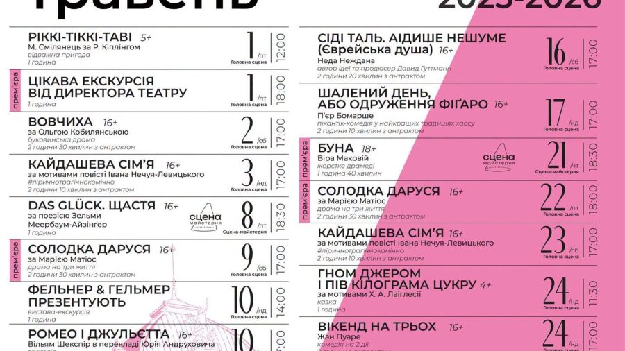 Дві прем’єри та екскурсія від директора: у Чернівецькому муздрамтеатрі представили афішу на травень