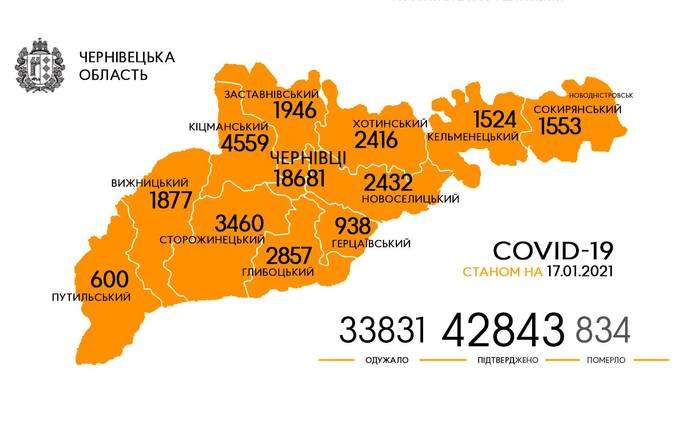 За весь період (станом на 17 січня 2021 р.) у Чернівецькій області підтверджено 42843 випадків зараження коронавірусом, повідомляє Чернівецька ОДА.