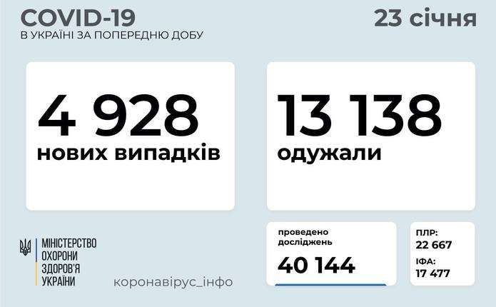 4 928 нових випадків коронавірусної хвороби COVID-19 зафіксовано в Україні станом на 23 січня 2021 року. Зокрема, захворіли 166 дітей та 261 медпрацівник. Про це інформує телеграм-канал Коронавірус Інфо.