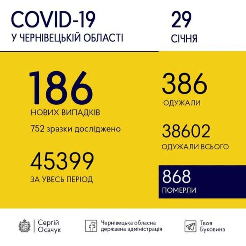 29 січня на Буковині виявили 186 нових випадків коронавірусу.