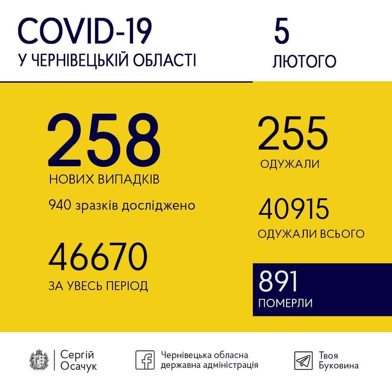5 лютого на Буковині виявили 258 нових випадків коронавірусу.