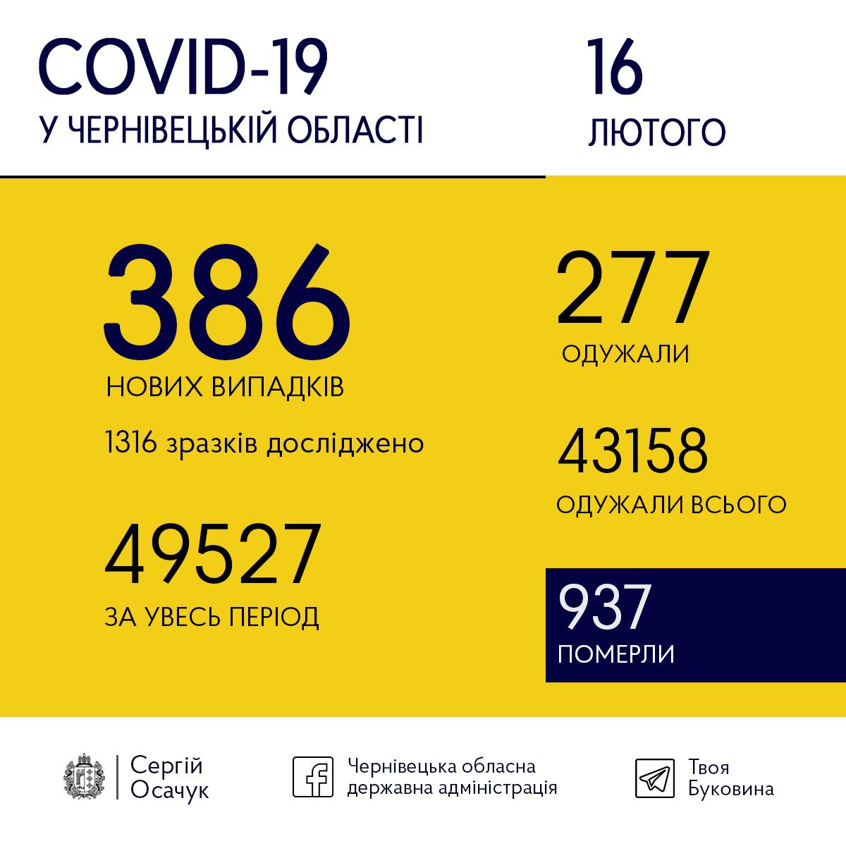 А на Буковині минулої доби виявили 386 нових випадків. Фахівці дослідили 1316 зразків аналізів.