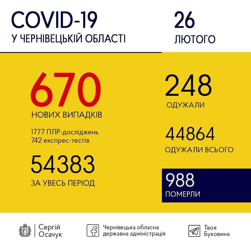26 лютого на Буковині виявили 670 нових випадків коронавірусу.