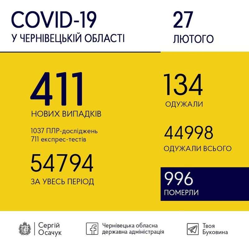 27 лютого на Буковині виявили 411 нових випадків коронавірусу.