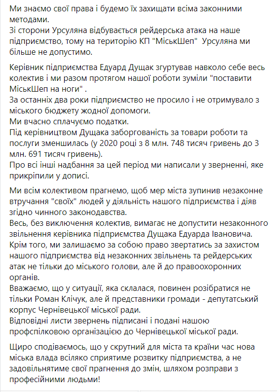 Але на нас почали незаконно тиснути, а, власне, вирішили «розібратись» з керівником нашого підприємства Дущаком Едуардом Івановичем. І, нібито, безпідставно прагнуть звільнити його з посади», — йдеться в дописі.