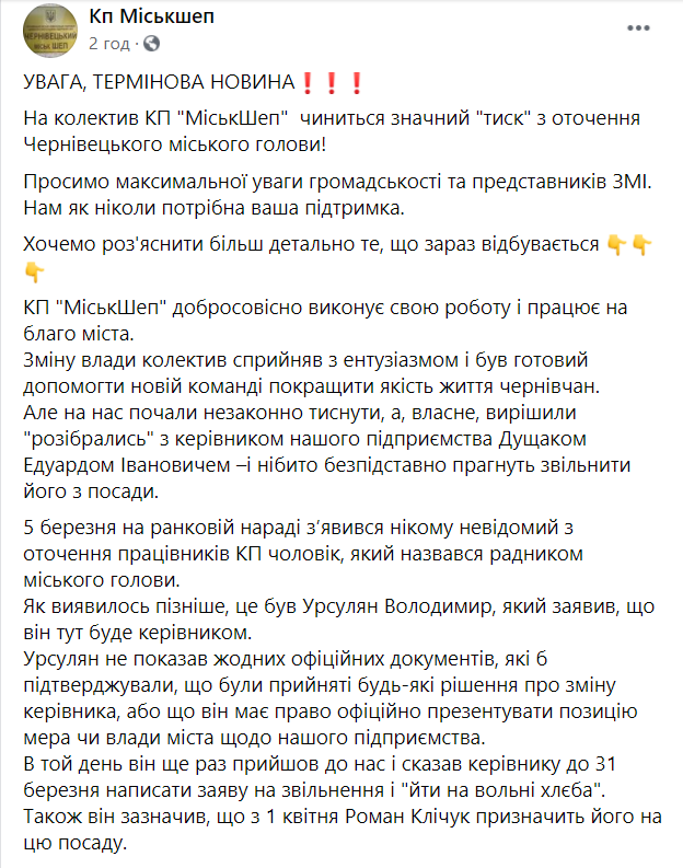 «На колектив КП «МіськШеп» чиниться значний «тиск» з оточення Чернівецького міського голови! Зміну влади колектив сприйняв з ентузіазмом і був готовий допомогти новій команді покращити якість життя чернівчан.