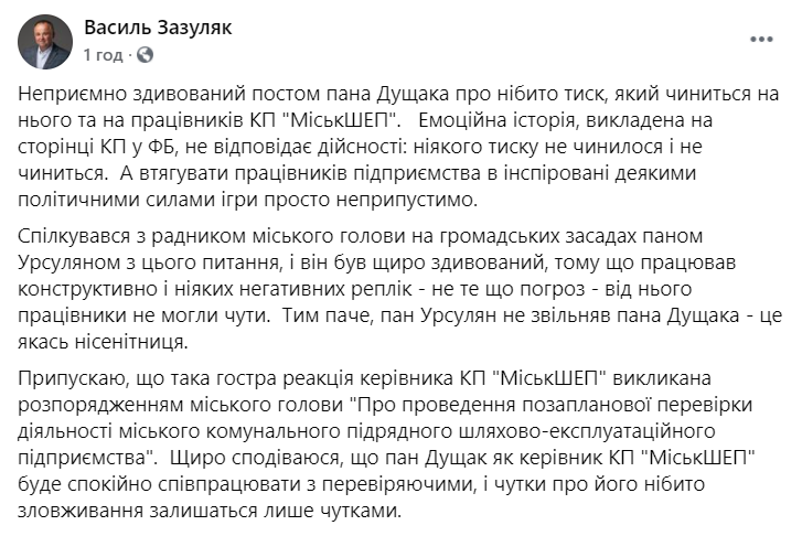 Щиро сподіваюся, що пан Дущак як керівник КП «МіськШЕП» буде спокійно співпрацювати з тими, хто перевіряє, і чутки про його нібито зловживання залишаться лише чутками», — написав у фейсбуку Василь Зазуляк.