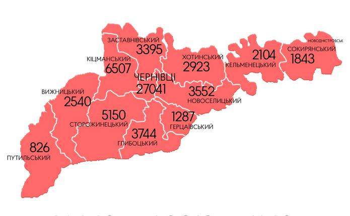 Найбільше інфікованих у Чернівцях (27041), Кіцманському (6507), Сторожинецькому (5150), Глибоцькому (3744), Новоселицькому (3744), Заставнівському (3364), Хотинському (2923) районах. Найменше людей заразилися на Путильщині (826).