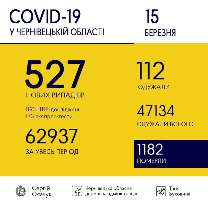 15 березня на Буковині виявили 527 нових випадків коронавірусу.