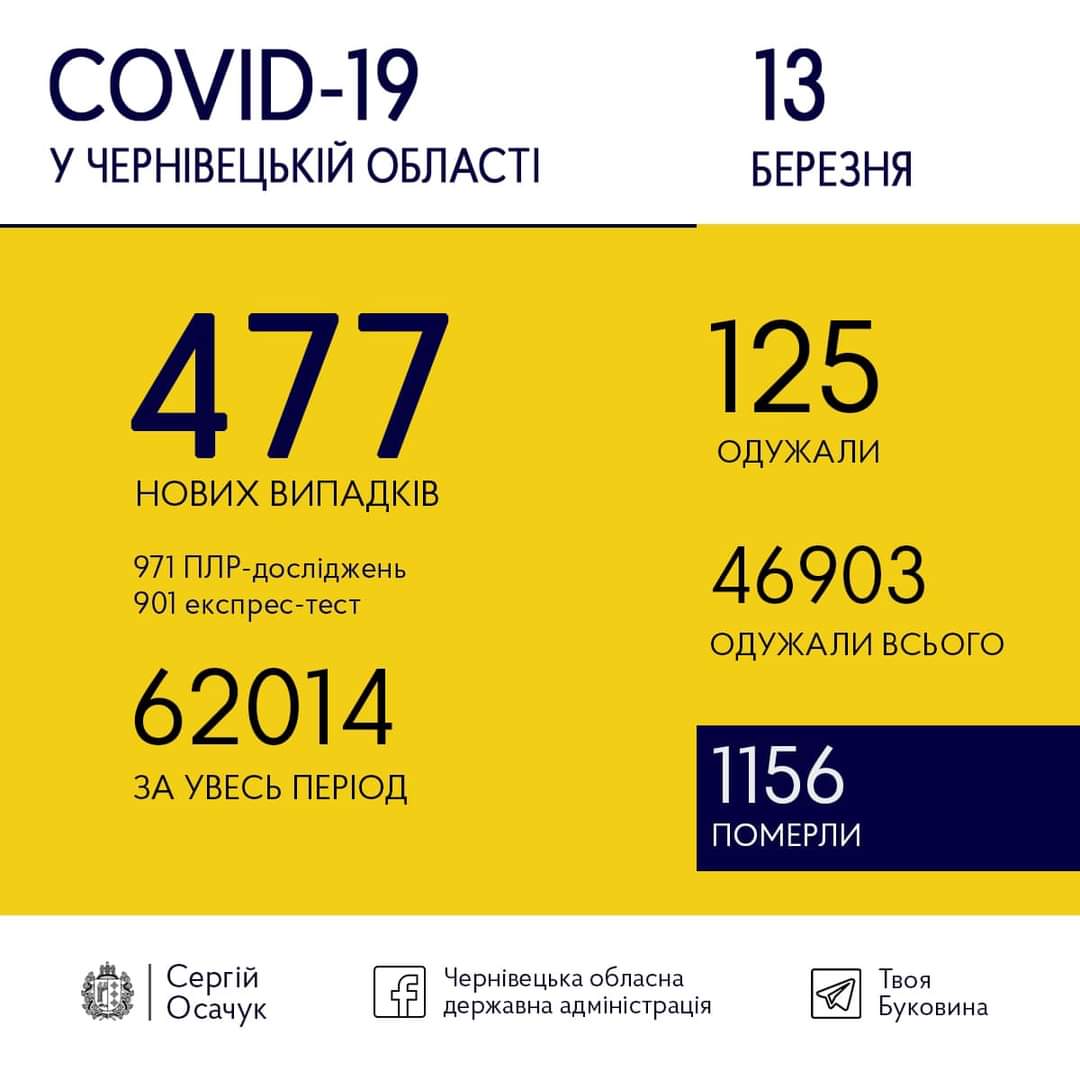 Станом на 14 березня на Буковині виявили 477 нових випадків коронавірусу. Одужали за добу 125 людей.