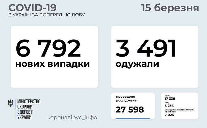 6 792 нових випадки коронавірусної хвороби COVID-19 зафіксовано в Україні станом на 15 березня 2021 року. Зокрема, захворіли 326 дітей та 109 медпрацівників. Про це інформує телеграм-канал Коронавірус Інфо.