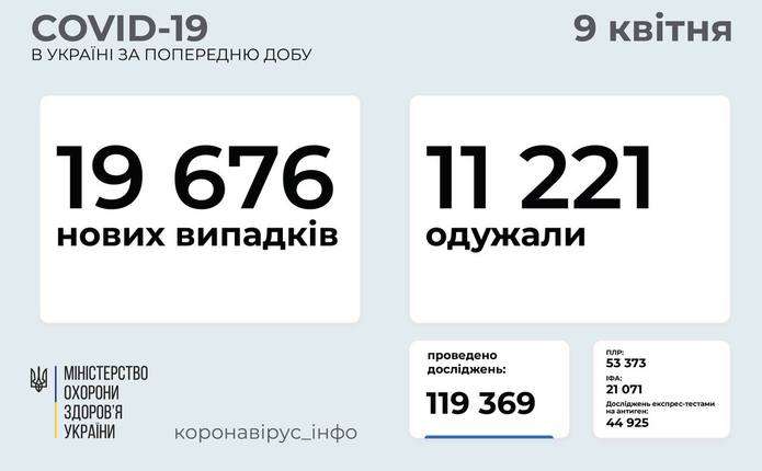 19 676 нових випадків коронавірусної хвороби COVID-19 зафіксовано в Україні станом на 9 квітня 2021 року. Зокрема, захворіли 751 дитина та 552 медпрацівники. Про це йдеться у Telegram-каналі “Коронавірус-інфо”.