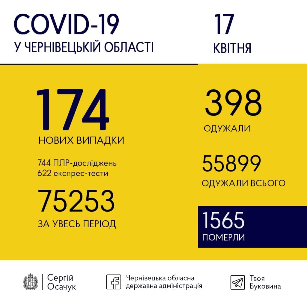 У Чернівецькій області минулої доби зафіксували 174 нових випадки COVID-19. Водночас медики провели 744 ПЛР-дослідження та 622 експрес-тести.